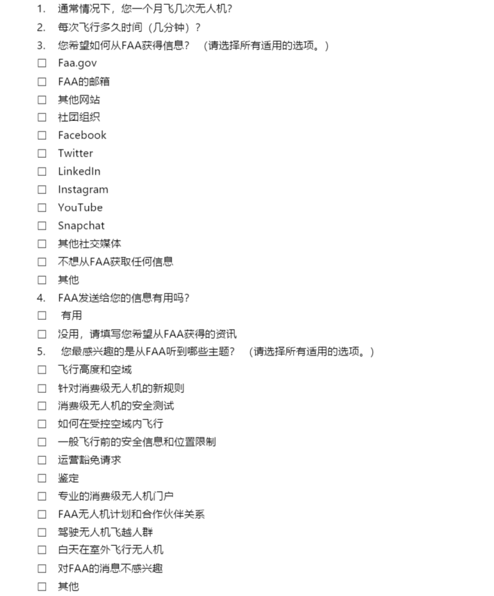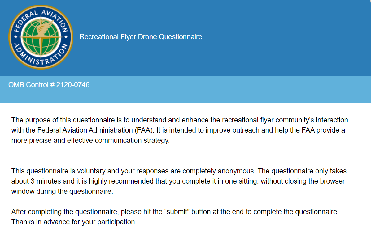 无人机网新闻中心消息称,美国联邦航空管理局(FAA)发布一则调查问卷,邀请广大无人机爱好者参与,旨在为当局提供更加精准的沟通渠道,与消费级无人机爱好者建立更紧密的联系。