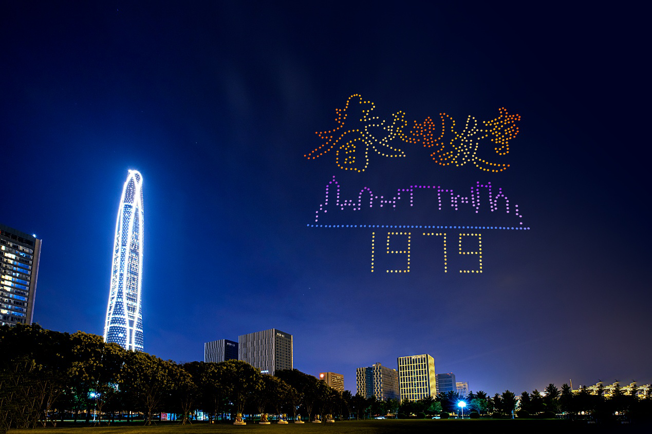 随后,无人机再次变换,一座座摩天大楼拔地而起,旧貌换新颜,没有改革开放就没有中国的今天,1979年,唱着《春天的故事》,走进中国新时代。