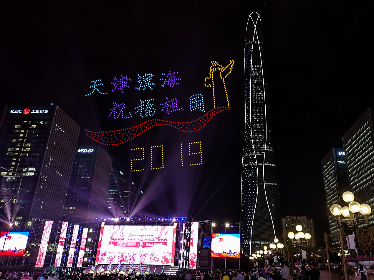 这场声光璀璨的科技灯光大秀,是来自天津开发区本土企业一飞智控,在新中国70周年之际,用自己的方式为祖国献上的最深情祝福,同时,这也是北方目前架次最多,规模最大,场面最震撼的无人机灯光秀活动,稳稳占据了各大媒体、社交互动平台等话题榜首。