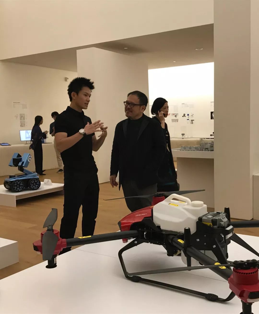 极飞工业设计总监肖锭锋(左)向国际著名设计师刘小康(右)介绍 P 系列设计理念