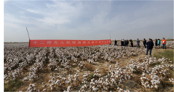 由于近年无人机植保作业在新疆地区迅速增长,在新疆地区作业的植保无人机数量已经超过4500架,缺乏行业标准的大规模作业带来了散乱差的问题,直接导致在新疆许多团场出现了重喷漏喷现象,最终直接影响到棉花等农作物的产量。特别是在棉花生产领域,缺乏标准化规范的无人机植保团队在脱叶剂喷洒作业后会出现田间成行的整株叶片青绿没有脱落现象的棉株,脱叶率只有43%左右,达不到机械采收的条件,给农户造成严重损失。本次试验所需要的脱叶剂产品均为拜耳公司提供的新一代产品脱吐隆,为试验提供了有力的保障和支持。