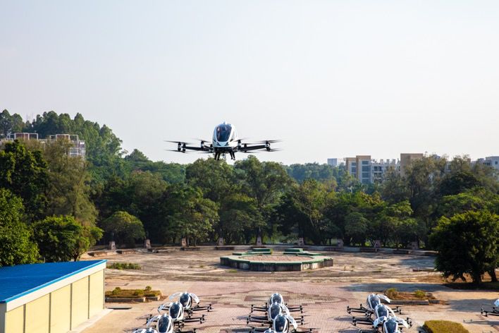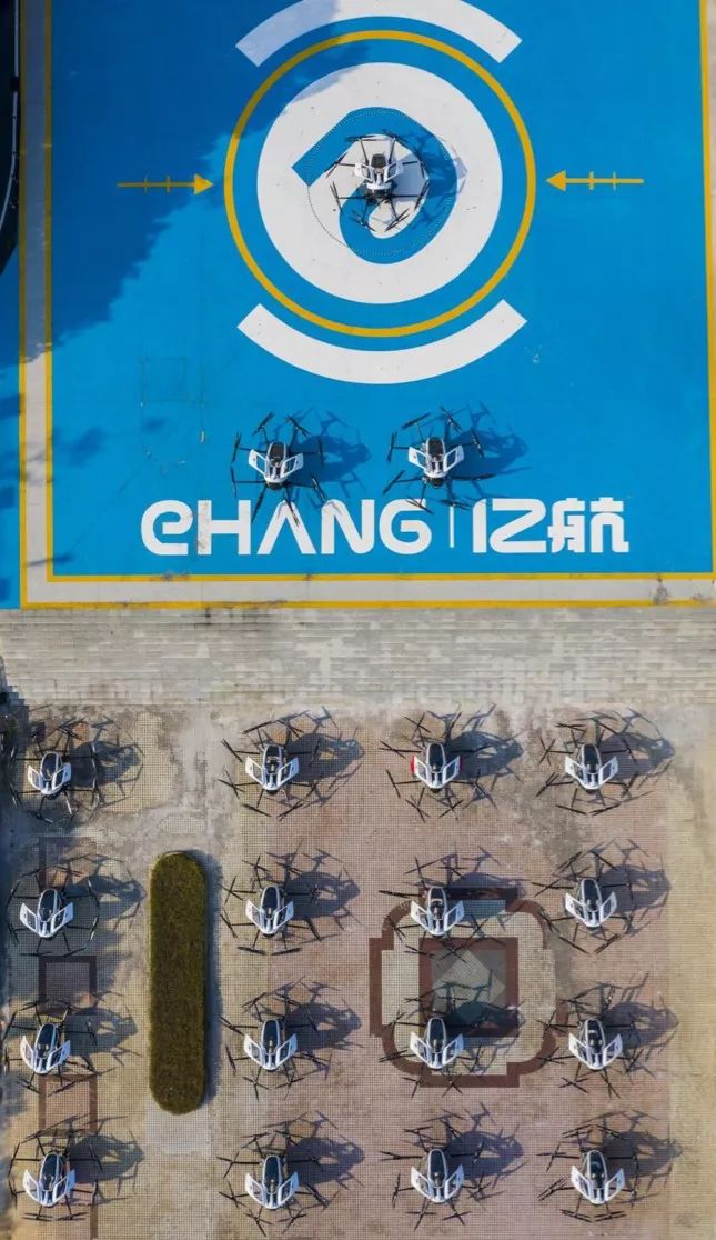 (图:3架亿航216同时腾空起飞,即视智慧城市空中交通未来图景)