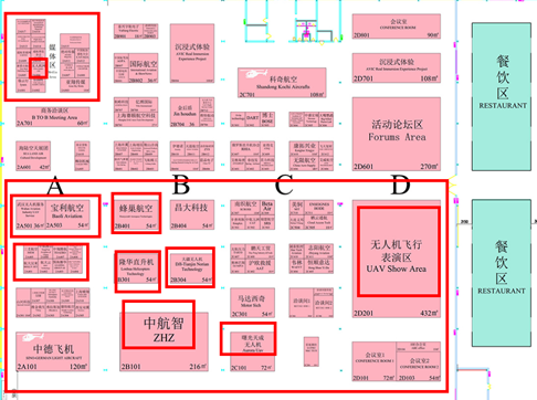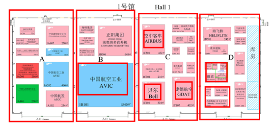 通过展位图可以看出1号馆主要是汇聚了全球通航企业,包括全球知名企业空中客车、贝尔等,主要是集中在C区。D区则主要是海外其他通航企业,如印度捷特航空、俄直、加拿大展团等。值得注意的是中国军团方面占据本次航展的主导地位,中国航空工业此次成为1号馆的最大焦点,独占B区一半面积,同时1540平的展位足以彰显我国丰富的储备实力。于此同时在1号馆的A区我们可以看到这十多家参展单位都是来自中国。