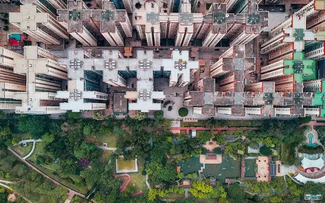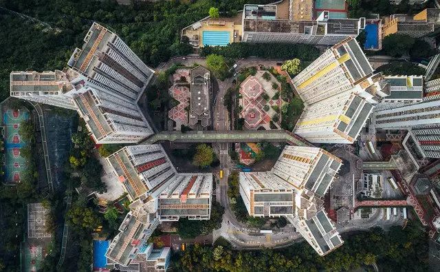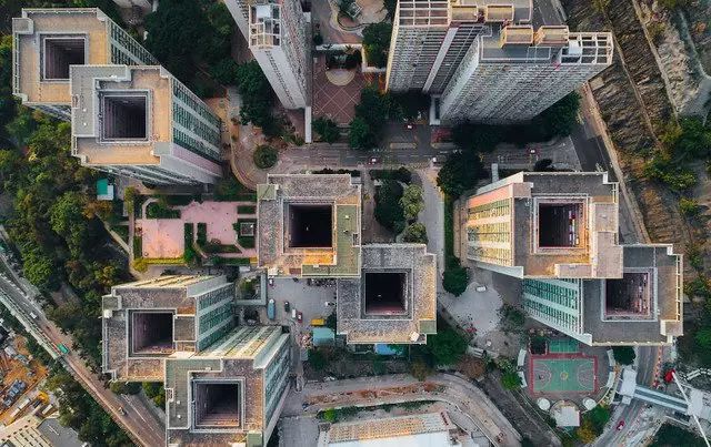 香港九龙,曾经是世界人口密度最高的地方,90年代大拆迁,旧城改造,建筑向空中延伸,摄影师航拍这些密集的建筑物,这种封闭的蜗居,窗户是人们接触外界空气的唯一途径。