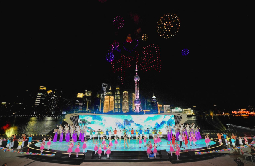 一曲质朴而真诚的《国家》,在外滩唱响,余韵悠长。999架无人机创新性地演绎了中国龙、长城等3D图案,动态效果的呈现让整体视觉更多彩灵动。