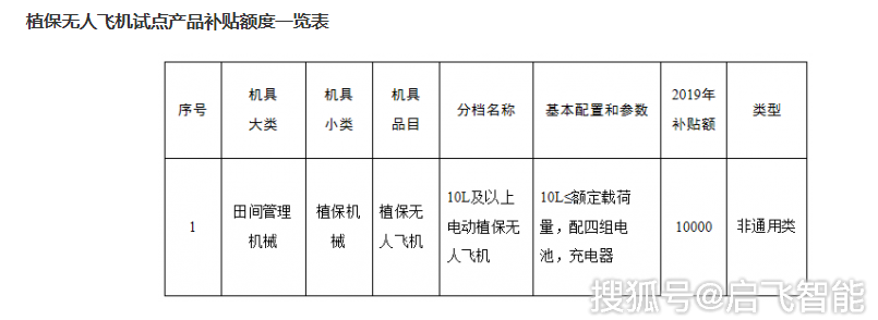 试点产品实行定额补贴,载药量10L及以上的电动植保无人机,单机补贴额10000元。分档、参数及补贴标准可视情况按年度进行调整。