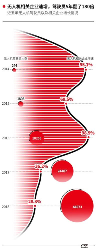 2014年全国持有无人机驾驶员合格证(固定翼/旋翼/飞艇)的总人数仅有244人,而2018年增至44573人,五年时间无人机驾驶员数量增长181倍。