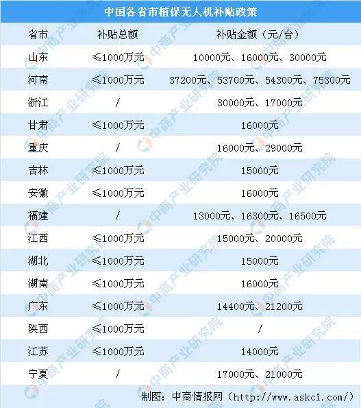 目前,进入补贴试点的省市已有浙江、安徽、江西、湖南、广东、重庆、吉林、福建、甘肃、江苏等十余个省市。在整体试点资金安排上,基本为千万元量级。政策支持下植保无人机市场在全国就进入快速发展期。