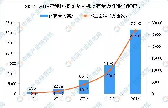 历经10年探索,我国植保无人机保有量和作业面积大幅增加。2014年植保无人机保有量695架,作业面积426万亩次。2018年,我国植保无人机保有量达到3.15万架,作业面积达2.67亿亩次。