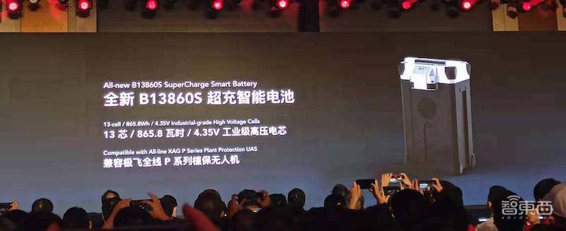 超充智能电池的电能为865.8瓦时,可以兼容极飞全线的P系列植保无人机。