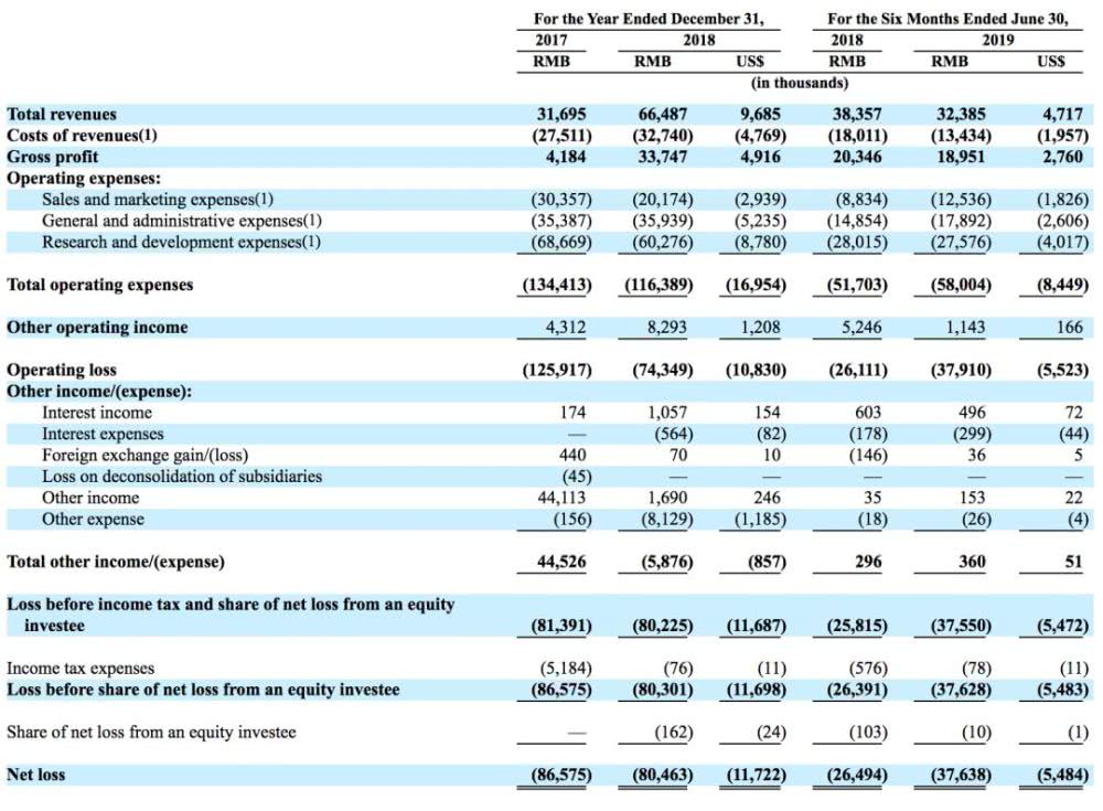 2019年上半年,亿航无人机营收3239万元,较2018年同期的3836万元减少15.6%;净亏损则达到3764万元,较2018年同期的2650万元却有42.1%的增加。