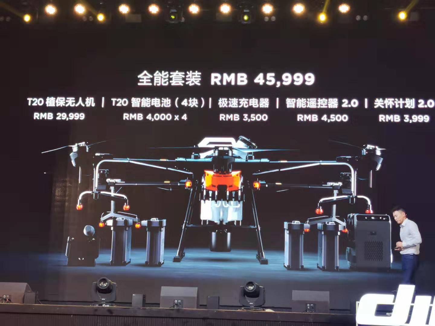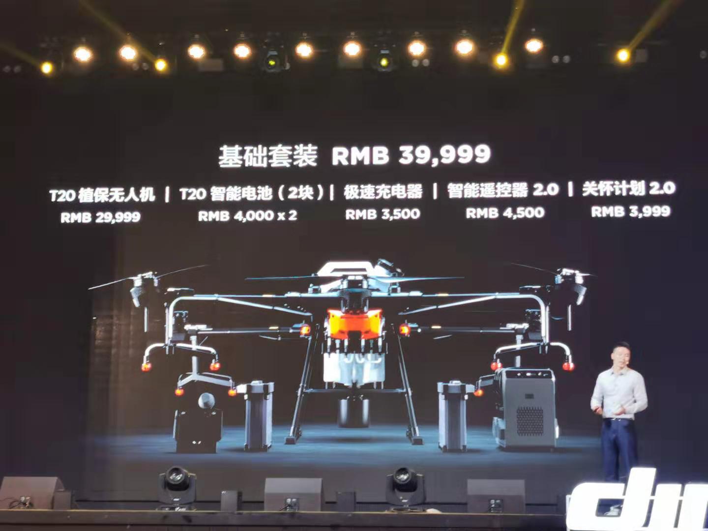 本次发布会最为重要环节已经来临!大疆新品T20植保机单机售价为29999元,这个价格一经发布让现场无数嘉宾欢呼雀跃,与前几年相比这个价格就是“白菜价”。不仅如此,大疆农机套装价格更是诱人不已,基础套装价格为39999元(包含2电1充)全能套装价格为45999元(包含4电1充的)。于此同时,两个套装均包含关怀计划2.0、RTK服务等。看到这里,小编已经无法自已,试想一下明年的植保行业将会是如何场景,我们已经不言而喻。一方面,植保机价格的降低势必会加大植保机购买数量以及作业面积。另一方面:植保机企业之间的价格之争将会愈演愈烈,而且用户植保作业价格势必也会再次降低。总之,继大疆新品发布之后,预测明年无人机植作业市场将会迎来新的高度。