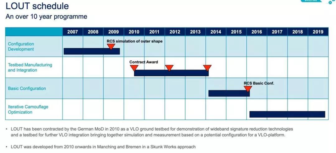 空客公司声称,德国LOUT演示机采用一整套完整的隐身方案设计,具有隐身平台所必须具备的三大领域能力特征:减少雷达、视觉、红外和声学信号;电子对抗能力;对机载雷达电子设备的射频综合管控。
