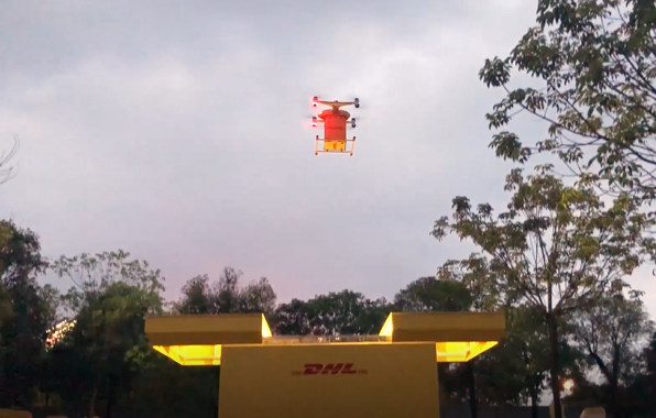 视频中,DHL的工作人员收到需要快递的文件后,通过身份证和刷脸识别双重认证,打开一个黄色的柜子,里面停着一架无人机,四螺旋桨那种,机舱是个大铁盒。工作人员把快递放在盒子里,关上铁盒。一会儿铁盒顶部打开,无人机腾空而起。飞越城市的建筑物和道路,停在目的地的柜子里,和前面那个柜子一模一样。停稳后,DHL的收件员同样通过刷卡和刷脸取快递。