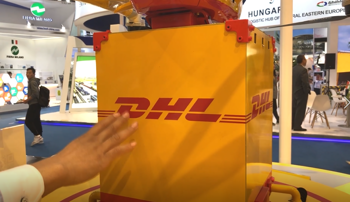 DHL在现场陈列了自家集成的无人机配送货系统最重要的硬件:运送快递的无人机。这台由无人机最远可以在半径8-10公里的范围内进行货物的配送服务,其载重达到5.4公斤,正好是亚马逊之前使用的无人机服务设备运载能力的两倍。这台设备可以使原本40分钟的配货时间缩短至8分钟,大大提高送货效率。