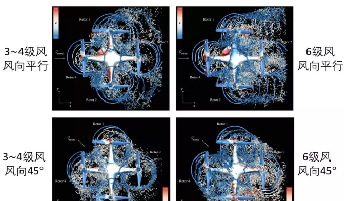 在实际情况中,诸如大疆精灵3这类小型无人机的飞行可能会对风速和风向等天气情况比较敏感。为了测试风速和风向对无人机飞行的影响,在CFD计算中,可以加入了不同的风速和风向并分析对无人机的影响。下图显示的是大疆精灵3无人机在不同风速和风向下产生的涡结构强度。可以看到,当在有风的环境中,不同螺旋桨产生的涡结构会不对称,也就意味着不同螺旋桨产生的升力不一样,这种不对称的升力会让无人机有翻转的倾向。当风速达到一定值的时候,无人机就就出现翻转。因此,在无人机的设计中,能够承载的最大风速是需要考虑的重要因素之一。