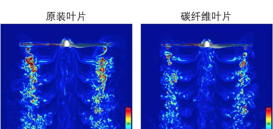 螺旋桨叶片的材料对整体无人机的整体性能有很大的影响。在无人机使用者中,经常有人选择使用碳纤维螺旋桨叶片。通常来说,碳纤维叶片比原装的叶片产生的噪声更小,寿命也更长。但是,原装叶片和碳纤维叶片对无人机的飞行性能有没有影响呢?CFD计算可以给出这个问题的答案。下图显示的是使用原装叶片和碳纤维叶片的无人机螺旋桨所产生的涡的强度,可以很明显的看出原装叶片产生的涡的强度更大,也就意味着在相同条件下,原装叶片可以提供的升力比碳纤维叶片提供的升力要大。CFD计算结果显示,在一些情况下,原装叶片产生的升力比碳纤维叶片产生的升力大26%。