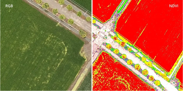 作为低空多光谱遥感系统的新成员,精灵 4 多光谱版上手即飞的优势,使得多光谱信息得以快速、高效的采集,用户可在实时 NDVI 和实时 RGB 影像之间进行切换,及时发现异常状况,从而快速做出针对性决策。