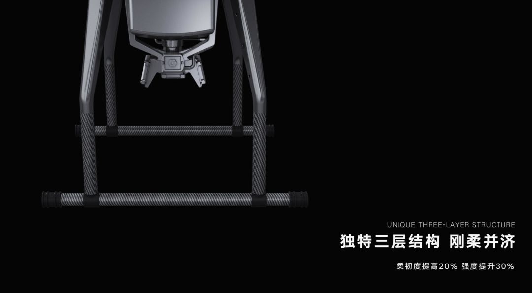 脚架的设计采用了三种材料复合技术,独特的三层机构刚柔有度,在保持原有重量的情况下,比传统的炭纤维脚架的柔韧度提高了20%。大幅度的提高脚架支持强度与抗耐摔系数,在多次的抗摔试验,脚架的损坏率为2%。