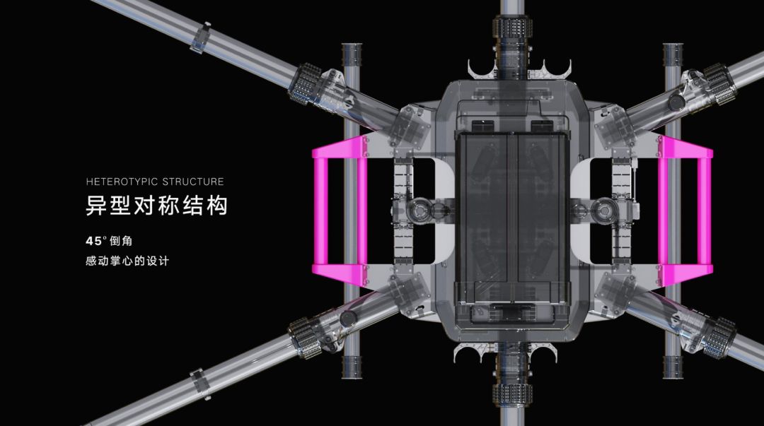 F22的外壳上采取二战德军虎式坦克炮塔的棱角设计的原理,搭配6轴碳铝复合机臂,展开2米的外观尺寸带来更硬朗的机身线条。这是一个农业生产工具应具备的特点,也使F22更加强势有力。