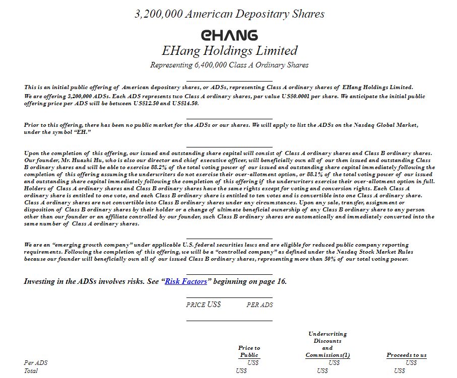 无人机制造商亿航今天凌晨向 SEC 更新了其递交的F-1 招股文件,预计将以“EH”为证券代码在纳斯达克挂牌上市。亿航计划在此次 IPO 中发行 320 万股美国存托股票(ADS),发行区间拟定为 12.5 至 14.5 美元。此次亿航 IPO 的承销商包括摩根士丹利、Needham&Co、老虎证券与质数资本。