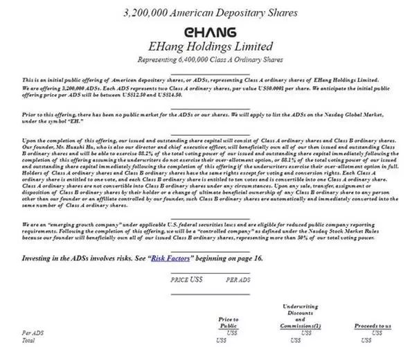无人机制造商亿航今天凌晨向SEC更新了其递交的F-1招股文件,预计将以“EH”为证券代码在纳斯达克挂牌上市。亿航计划在此次IPO中发行320万股美国存托股票(ADS),发行区间拟定为12.5至14.5美元。此次亿航IPO的承销商包括摩根士丹利、Needham&Co、老虎证券与质数资本。