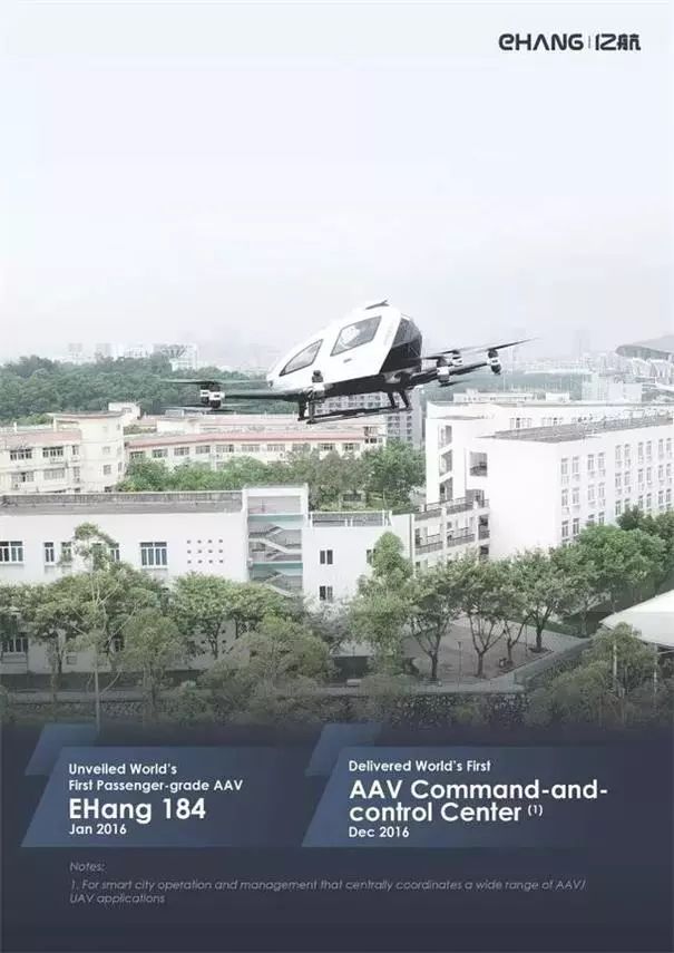亿航为外界所熟知是在2016年1月,当时在拉斯维加斯的CES上亿航凭借全球首款可载人AAV EHang184一战成名。而截至2019年10月31日,亿航无人机已经交付38台乘用级自动飞行器,用于测试、训练和演示,并建设了两个用于智慧城市管理的指挥控制中心。