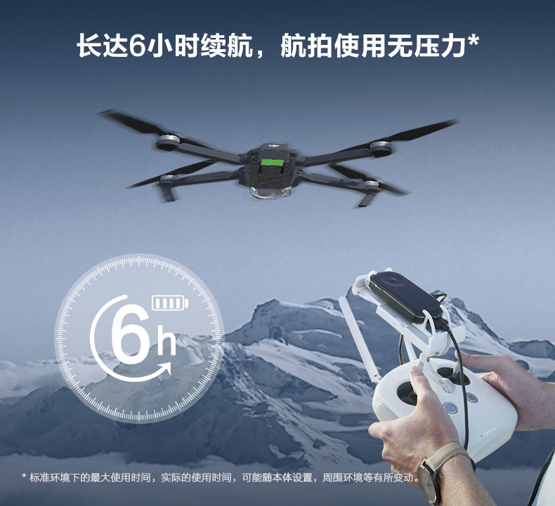 长达6小时的续航时间足够满足航拍场景的使用,用得放心,用得舒心。