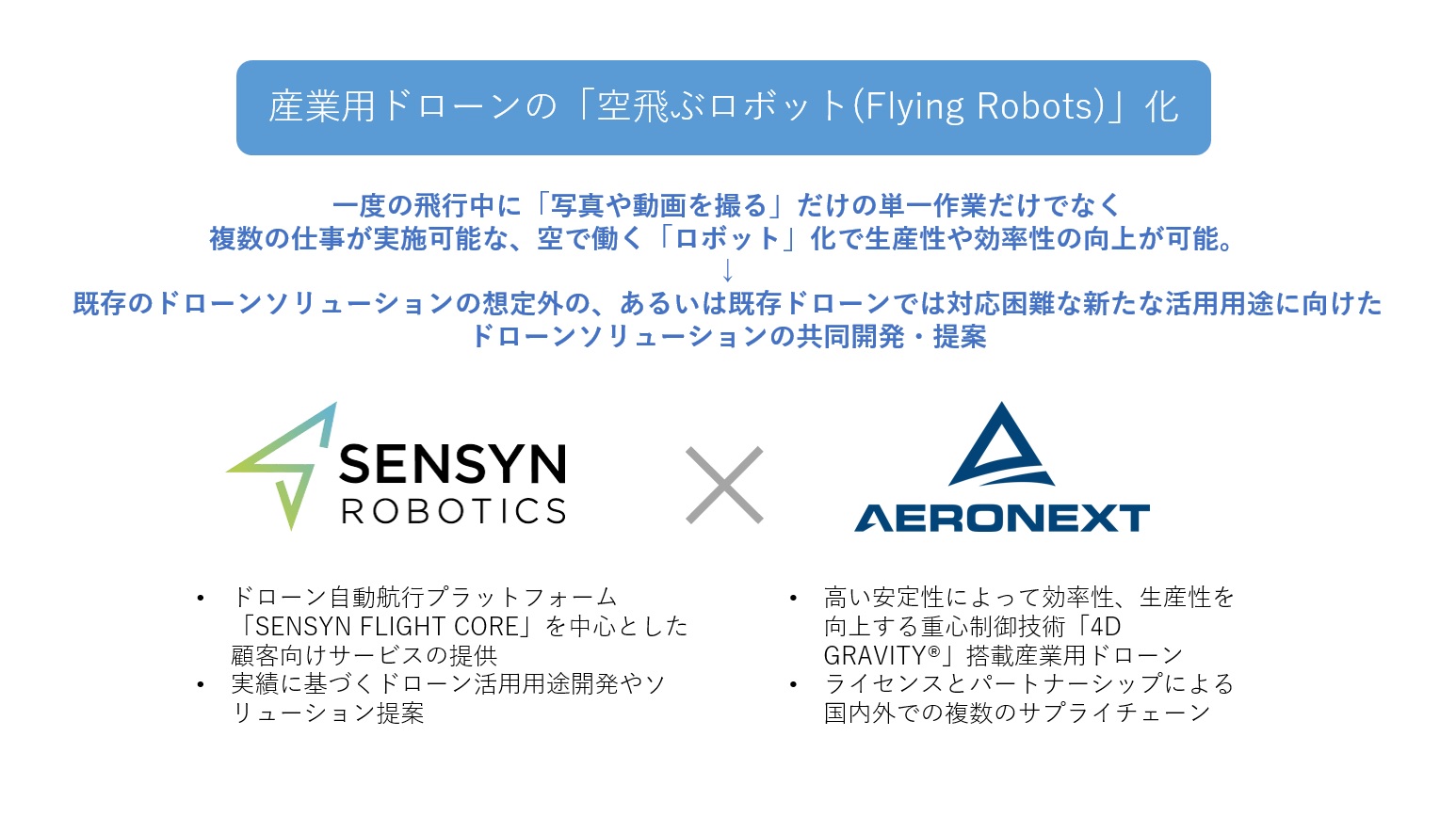 Senshin Robotics和Aeronext将结合他们在客户和应用程序开发的技术和专有技术,以结合各自的优势来实现下一代工业无人机概念--``Flying Robots''并解决客户的问题,还将为解决社会问题和实现基于无人机的社会做出贡献。