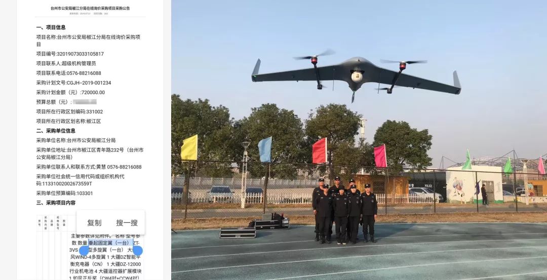 浙江台州椒江分局采购3VS复合翼无人机,3VS无人机凭借快速响应能力、长航时巡检、信号传输距离远、三轴稳定吊舱清晰查看地面移动目标细节、机载AI智能处理等多项强大功能,执行任务中可以实时配合一线警力,为地面警务人员提供可靠准确的信息支持,使得事件处理更加迅速、精准、有效。