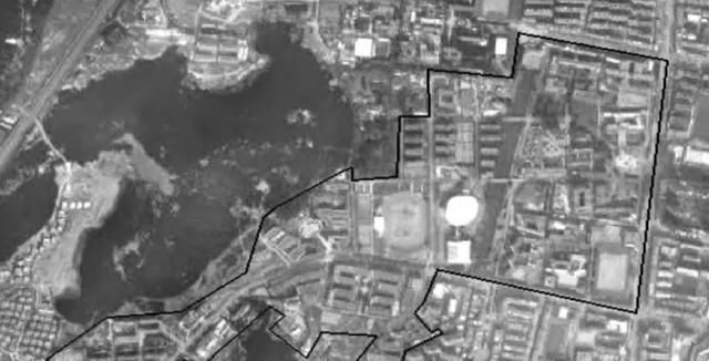 本文研究对象为江苏省师范大学泉山校区, 该对象位于江苏省徐州市铜山区,地势较为平坦,周边有高山。黑色实线范围为研究对象的测区范围,测区范围内高层建筑物和树木较多,地物较为复杂。测区面积约为0.8km²,研究对象的测区范围如图1所示。