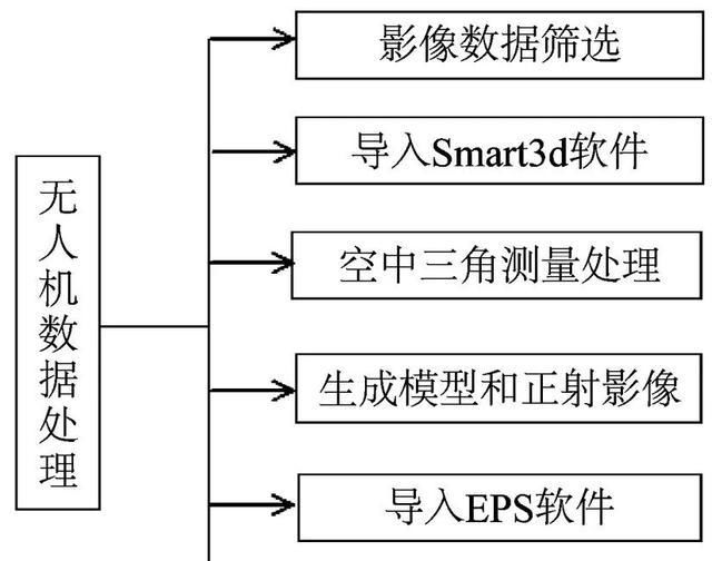 无人机数据处理使用的是Smart3D4.4.9 和 EPS2016三维测 图软件,Smart3D软件是将采集的无人机影像数据进行测区正射影像和三维实景模型的构建,EPS2016三维测图软件是依据测区正射影像和三维实景模型进行三维测图。