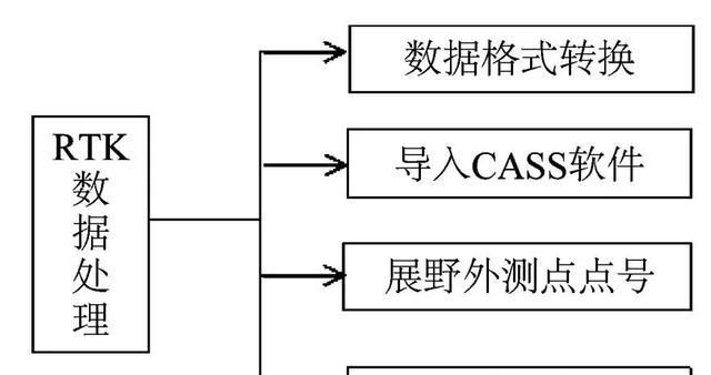 RTK 数据处理使用的是 CASS9.1软件,该软件主要是针对 RTK 和全站仪采集的野外数据进行地形图的绘制。由于该地形 图 是使用两种仪器进行测绘的,因此在绘制地形图之前需要将野外采集的数据进行合并和格式转换,转换成 CASS9.1软件可以导入的格式(点名,X,Y,Z转为点名,Y,X,Z)。然后导入到 CASS9.1软件中,野外测点点号,根据野外绘制的草图或者野外测点点名进行地形图的绘制,该方法测量精度受地理环境因素影响较大、效率较低。RTK 的数 据处理主要流程如图5所示。