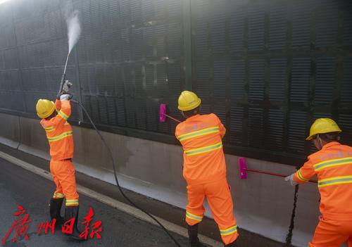 在广汕公路开创大道跨线桥上,三名身穿反光工作服的道路养护工作人员,正站在一辆专用喷洒车前旁,拿着高压水枪和扫把对桥段两边的隔音屏进行冲洗清理。“冬天由于少雨,桥上的护栏和隔音屏积攒的灰尘比较多,我们一般都是定期清洗。”长平养护站的一位养护人员告诉记者。记者了解到,为确保公路附属设施干净整洁,市道路养护中心会定期组织清洗隔音屏,对受汽车尾气和灰尘污染的公路沿线护栏、隔音屏等设施进行清洗。