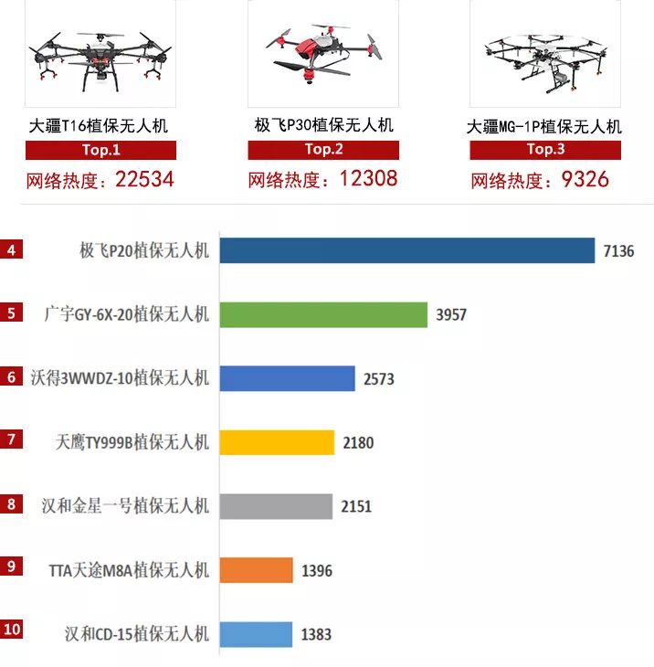 在植保无人机产品方面,2019年,植保无人机产品网络热度排行榜中,大疆T16植保无人机以2.3万人的关注度获得第一名。