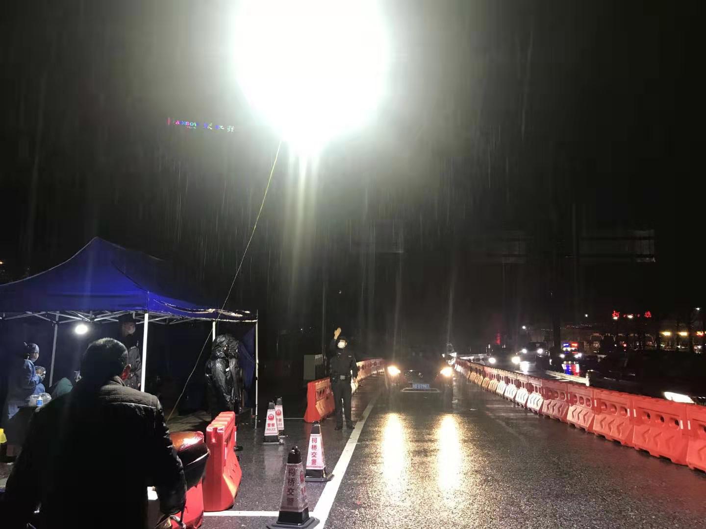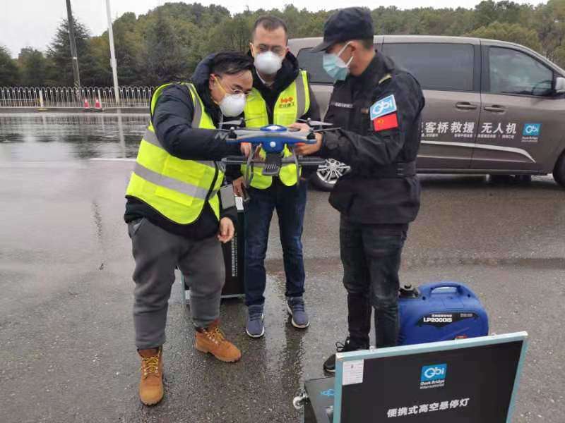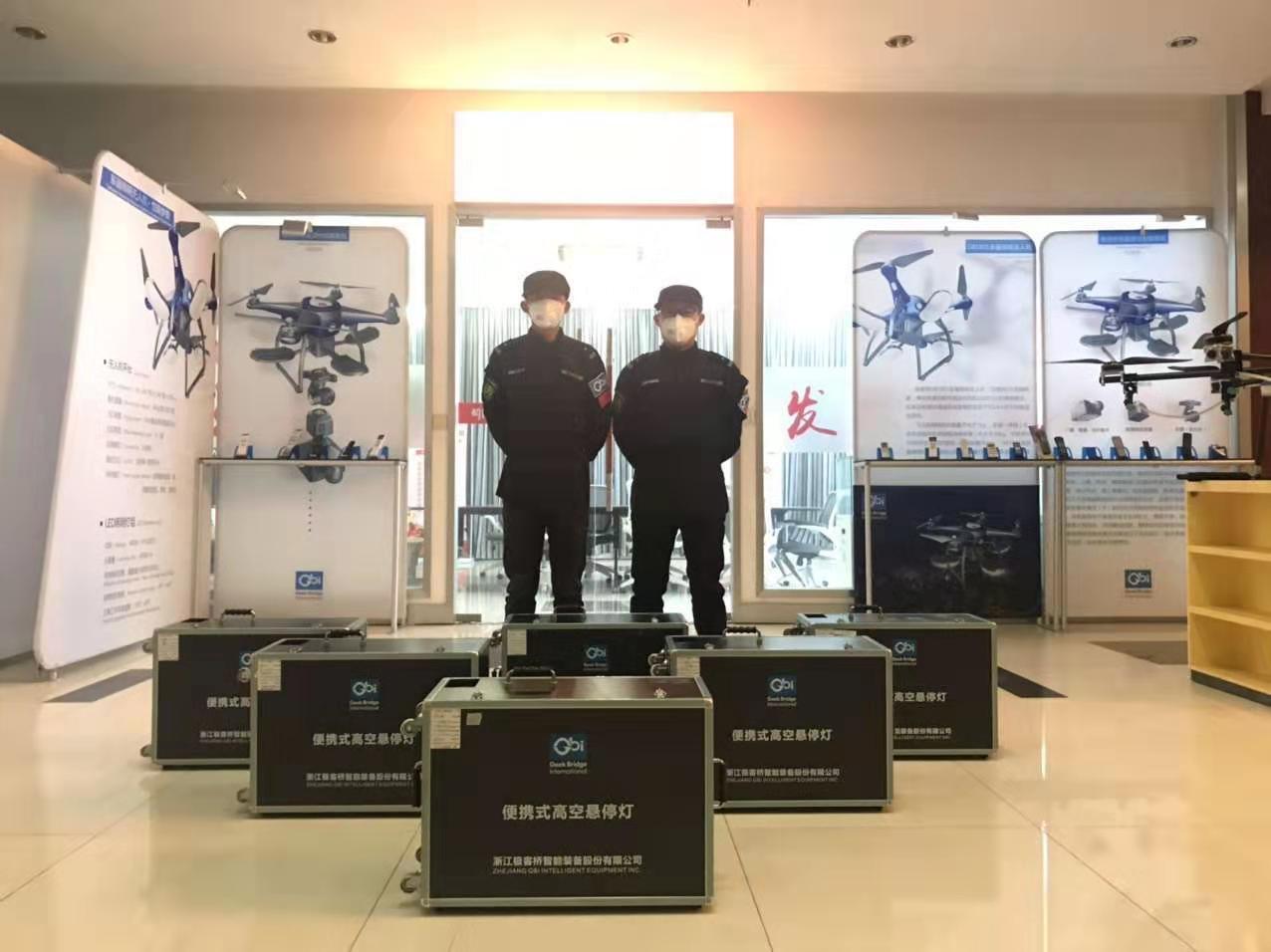 自湖北省武汉市发生不明原因肺炎疫情后, 全国人民高度关注,各地医疗物质、医务精英奔赴前线。1月25日,来自浙江绍兴的无人机企业极客桥携带6台系留照明无人机在经历了16个小时路程后已顺利送达武汉建工指挥部工作人员手中,当天夜里在朦胧细雨的情况下在检查站附近为周边过往检查车辆提供充足的照明,加快检查速度。
