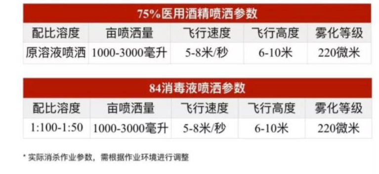 当务之急,极飞R80农业无人车的任务就是与极飞农业无人机空地配合,对疫情进行防控消杀。目前,城市街道、社区、农村喷洒的消毒剂主要是 84 消毒液(一般有效的氯浓度为4%-7%)。在 R80 无人车正式上岗前,极飞防疫专项组根据过去与中国疾控中心、拜耳环境科学等合作机构开展的防控试验成果,及此前参与的抗震救灾消杀经验和各地防疫效果,为 R80 配备了比常规消毒浓度更高的消毒液,让药液从无人车雾炮喷射出到落地的过程中,和空气里、地面上的水分继续稀释,持续杀菌,从而保障消杀防疫效果。药液配制方法和喷洒参数如下:
