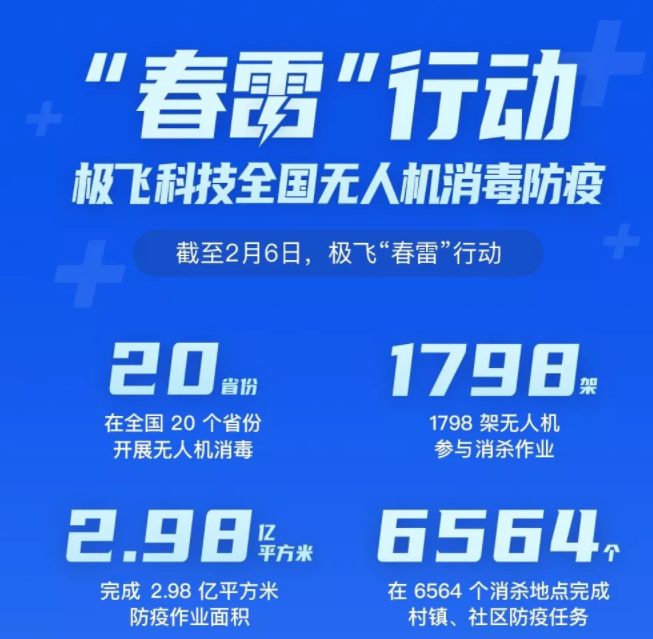 自疫情爆发以来,极飞科技在1 月 31 日正式宣布启动“春雷行动”,投入500 万元人民币,设立防疫消杀专项基金,为全国极飞用户义务防疫消杀作业保驾护航。此次行动也是号召全国飞手积极报名展开病毒防疫工作,极飞表示公司愿意承担为期 1 个月的整机配件维修费用,原先已购买的全保服务或延保服务期限,也将免费延长 1 个月。据了解,目前全国各地极飞用户及代理商踊跃报名,而且喷洒作业超过上亿亩面积。