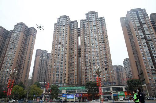 “请大家关好门窗,现在准备使用无人机在空中喷洒消毒液……”在上海某小区,伴随着嗡嗡的轰鸣声,一架携带有消毒液的大型无人机缓缓地升空,接着从空中喷洒出消毒液进行防疫消毒作业。