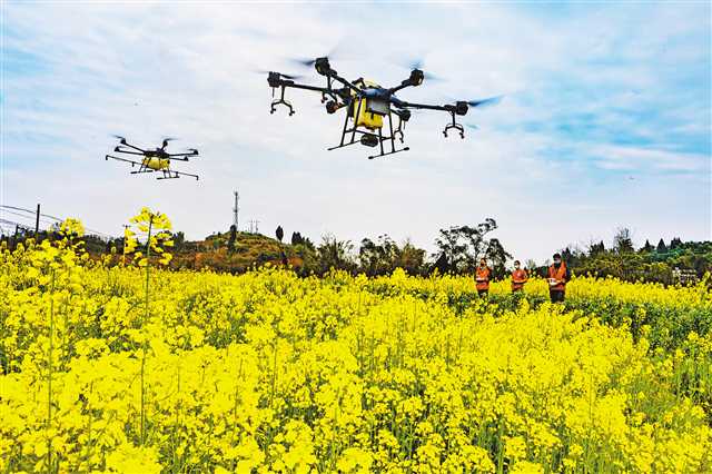 2月29日,大足区万古镇升斗村,植保无人机正在油菜地里作业。据了解,大足区年均植保面积48万亩,近年来通过引进推广节水、节药、高效的植保无人机等现代植保机...