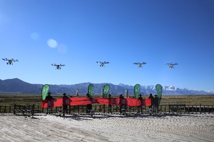 2019 年 5 月 29 日,10 架搭载着播撒系统的 MG-1P 植保无人机,在阿拉尔金草滩湿地公园均匀播撒着一颗颗草籽。