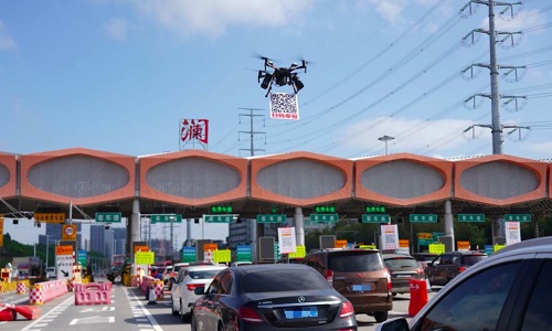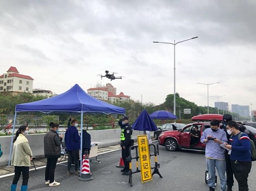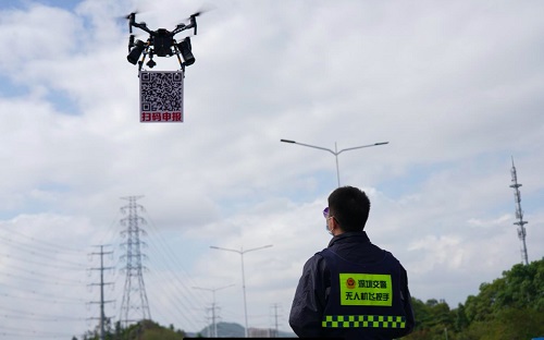 带着申报二维码的无人机一路飞向队伍后排,用搭载的喊话器通知司机提前申报