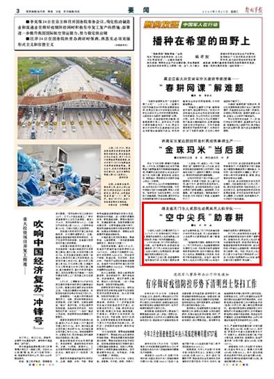 “家里种了几亩小麦,受疫情影响一直没能去打药,正发愁小麦病虫害会不会影响收成。”天门市汪场镇贫困户林华平告诉笔者,市人武部调来无人机免费为大家喷洒农药,解了燃眉之急。