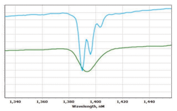 oreXpert(蓝色)和oreXpress(绿色)分别测量滑石的样品,oreXpert(蓝色)更高的分辨率的光谱仪可以在20nm内分辨出三个吸收峰。