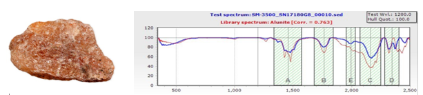 明矾石:匹配GeoSPEC光谱库,样品在1440、1475、1760、2165/2206、2320nm附近具有特征吸收特峰,匹配相关性为0.763。
