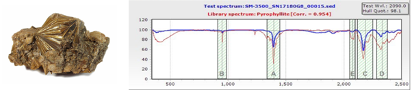 叶腊石:匹配GeoSPEC光谱库,样品在1396、2066 / 2078、2168和2320 nm附近具有特征吸收特峰,匹配相关性为0.956。