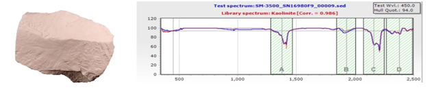 高岭石:采集光谱后使用EZ-ID软件匹配SPECMin光谱库,样品在960、1400/1412、2100/2206、2310、2350和2380nm附近具有特征吸收峰,样品中有部分铁元素的存在,匹配相关性为0.986.