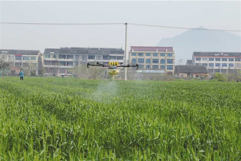 时下小麦已进入扬花初期,正是赤霉病等病虫害防控的关键时期,与往年不同,院桥镇的种田“老把式”们在麦田管理中融入了更多的农业科技。图为近日在院桥镇前宅粮食功能区内,该镇种粮大户郑永正用租用的无人机对260亩的小麦进行病虫防治。