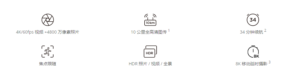 Mavic Air 2在拍摄能力上已经隐隐超过比Mavic 2变焦版,搭载了一颗1/2英寸CMOS传感器,可拍摄4800万像素照片,能以120 Mbps码流录制4K/60fps视频,支持H.265编码格式,更节省存储空间;并首次支持 HDR 视频、 1080p/240 fps 慢动作摄影,还可拍摄8K移动延时视频,这个功能是大疆其它无人机产品没有的。