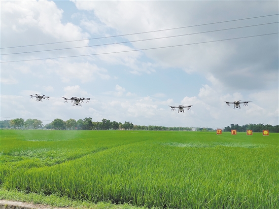 江门日报讯 (文/图 记者/周晓营) 1台无人机飞防服务1小时可以施肥、喷洒药物超过百亩田,成为农业产业化的“标配”。近日,在恩平市牛江镇昌梅村国家级万亩水稻生产示范基地,近10台统防统治无人机集中起飞,为春耕生产及水稻病虫害统防统治提供助力。当天,江门市春耕生产现场会暨水稻病虫害统防统治推进会在牛江镇举行,现场会用科技手段加强统防统治效果,为春耕生产保驾护航。